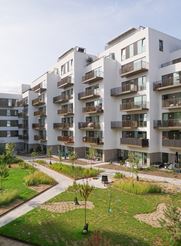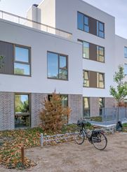 Bebyggelsens hovedvolumen fremstår med en base i tegl og i højden med en pudset facade. Alle lejligheder har store altaner eller haver og adgang til fælles gårdhave. Nogle har privat tagterrasse.